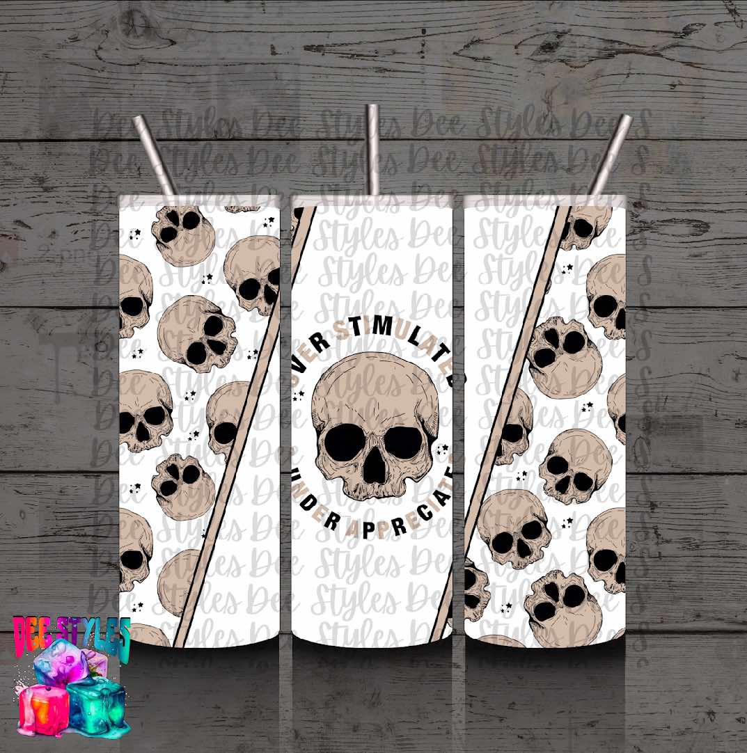 Introducing the Overstimulated Underappreciated Skeleton 20 oz! This tumbler is perfect for keeping your drinks cold or hot on the go. With its 20 oz size, it's the perfect companion for your daily adventures. Plus, the sublimation feature allows for unique customization options. Stay hydrated in style!